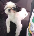 Cachorro da raça Shih Tzu de porte pequeno com pelagem média nas cores branco e preto. Possui uma distribuição da cor preta principalmente na orelha esquerda e em áreas próximas aos olhos e orelhas. A pelagem é lisa e bem cuidada. Os olhos são de cor marrom e são bastante expressivos. O focinho é curto, típico da raça, e as orelhas são caídas. A cauda é reta e encobre parte do dorso, com pelagem semelhante ao restante do corpo.