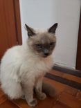 Gato de raça Siamês de porte pequeno com pelagem de comprimento médio. O corpo é de cor branca com extremidades escuras em cinza, incluindo as orelhas, rosto, patas e cauda. Os olhos são azuis e as orelhas estão em pé. Possui um padrão de pelagem típico dos Siameses, com uma máscara escura na face.